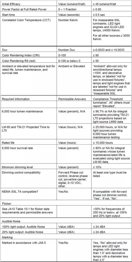 在舊版CEC Title 24中,針對使用LED光源的家用燈具的性能要求,在Joint Appendix JA8中重點只關(guān)注光效、色溫、顯色指數(shù)等基本參數(shù)。在2016年最新版中,CEC Title 24針對高光效光源的產(chǎn)品,在Joint Appendix JA8中新增加了許多性能要求。